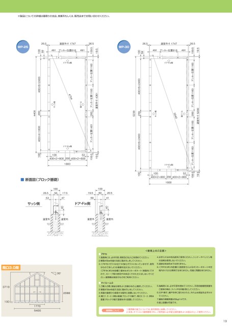 19.5159.526.5491アンカー位置8184915910026.5温室外寸1747WP-3019.5159.526.5491アンカー位置8184915910026.5温室外寸1747WP-25※製品についての詳細は最寄りの支店、営業所もしくは、販売店までお問い合わせください。アンカー位置1160アンカー位置1160280アンカー位置1160アンカー位置1160温室外寸520019.5159.553400×2=800100400×2=8002001800ドア・Fix側ドア・Fix側400×6=2400サッシ側5540サッシ側2395239400×6=2400100温室外寸4361アンカー位置1160アンカー位置1160280アンカー位置1481ドア・Fix側サッシ側4754サッシ側19.5159.553400×2=800100400×2=8002001800ドア・Fix側400×6=24002004400400×4=1600100温室外温室内温室外温室内20.541401006019.559ドア・Fix側17.547401005626.553サッシ側■断面図(ブロック基礎)間口3.0間371910030°208817705400<使用上のご注意>●プチカ1.強風時には、必ず天窓、側窓及び出入口を閉めてください。2.積雪が30㎝を超える前に雪おろしをしてください。3.プチカ〉ガラスは全て半強化ガラスになっていますが、鋭利なもので突くような衝撃を加えないでください。〈プチカ(ポリカ仕様)〉面材はポリカーボネート(樹脂性)ですので、ストーブ等の使用や本体近くでのたき火はしないでください。暖房機は指定のものをご利用ください。●マイルームS1.ご購入の際、製品仕様をよくお確かめの上選択してください。2.積雪が30㎝を超える前に雪おろしをしてください。3.母屋の屋根から落雪する場所に設置しないでください。4.間口1.5〜2.0間は重量ブロック10幅で、間口2.5〜3.0間は重量ブロック12幅で基礎を作り設置してください。4.お手入れは中性洗剤をご使用ください。シンナーやベンジン等の溶剤は使用しないでください。5.温室は完全防水ではありません。6.プチカ(ポリカ仕様)〉温度変化によるポリカーボネート中空板内のくもりは異常ではありません。性能に問題はありません。5.強風時には、必ず天窓を閉めてください。天窓自動開閉装置をご使用の時は、スイッチを手動・閉にしてください。6.引戸・障子、網戸を枠に取り付けたら、外れ止め部品を必ずかけてください。7.棚板の積載荷重は50kgf/㎡です。8.屋上設置は可能です。暖房機について1.暖房機の施工については、販売業者に依頼してください。2.本体、オプション(暖房機等)共に、ご使用前に必ず組立説明書をよくお読みの上、ご使用ください。19