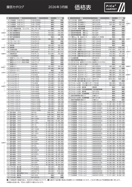 園芸カタログ2026年3月版価格表生産終了生産終了生産終了生産終了生産終了生産終了生産終了生産終了生産終了生産終了生産終了生産終了生産終了品名型式税込価格価格小型温室FHBタイプ小型温室FHBタイプ小型温室FHBタイプ小型温室FAKタイプ洋らん栽培用温室ランハウスFAL用棚板セット電子温度調節器電子温度調節器電子温度調節器内気扇プレートヒータープレートヒーター換気扇換気扇加温加湿器パネルヒーター薄型育成灯二灯式育成灯保湿プレートヒーター棚板セット(フック一体型2枚組)棚板セット(フック一体型2枚組)保温カバー保温カバー日よけカーテン日よけカーテンキャスターシェルフボードシェルフボードシェルフボードシェルフボードシェルフボードシェルフボードシェルフボードシェルフボードフラワースタンドフラワースタンドフラワースタンドフラワースタンドフラワースタンドフラワースタンドフラワースタンドフラワースタンドフラワースタンドフラワースタンド屋外温室プチカ屋外温室プチカ屋外温室プチカ屋外温室プチカ屋外温室プチカ屋外温室プチカ屋外温室プチカ屋外温室プチカ屋外温室プチカ屋外温室プチカ屋外温室プチカ屋外温室プチカ屋外温室プチカ屋外温室プチカ屋外温室プチカ屋外温室プチカ屋外温室プチカ屋外温室プチカ屋外温室プチカ屋外温室プチカ屋外温室プチカ屋外温室プチカ屋外温室プチカ屋外温室プチカ屋外温室プチカ屋外温室プチカプチカ用独立棚プチカ用独立棚プチカ用換気扇プチカ用換気扇取付パネルプチカ用攪拌扇プチカ用照明灯頁444455666666666677777777779999999999999999991010101011111111111111111111111111111111111111111111121212121212●この価格表の掲載内容は、2026年3月現在のものです。●生産終了品記載の製品は在庫無くなり次第廃盤となります。ご注文の際は必ず在庫確認お願い致します。※価格は改良の為、予告なく変更する場合があります。型式WP-S60*BWP-FU*VAWP-FU5VASF-2005A-SSF-2005A-TRA-327RA-328RA-329給油タンク38ℓ型WP-05HKBWP-10HKBWP-15HKBWP-20HKBWP-25HKAWP-30HKBWP-AN4ZAWP-AN8ZAWP-AN0ZASP-527A付属セット給排気スライドパネルOT-90SWP-05SPAWP-10SPAWP-15SPAWP-05SNAWP-10SNAWP-15SNAWP-P10WP-P151705型1708型換気扇天窓自動開閉機SKF-25ASP-527A付属セットSP-1210A付属セットAMS1520SAMS15202SAMS1530SAMS15302SAMS1540SAMS15402SAMS2020SAMS20202SAMS2030SAMS20302SAMS2040SAMS20402SAMS2050SAMS20502SAMS2530SAMS25302SAMS2540SAMS25402SAMS2550SAMS25502SAMS2560SAMS25602SAMS3040SAMS30402SAMS3050SAMS30502SAMS3060SAMS30602SAMS3070SAMS30702SAMS3080SAMS30802SAMS3090SAMS30902SAMS30100SAMS301002SFHB-908WHFHB-1508BLFHB-1508SFAK-1811BLFAL-1811BLFAL-PT10FHA-PS30FHA-PV20FHA-PW10FHM-PU10AFHA-PH10FHP-PH45FHJ-PF10FHB-PF10FHM-PH50SPE-200FHA-PL10FHA-PL20FHA-PH60FHB-PT10AFAK-PT10FAB-PB1FAK-PB1FHB-PK1FAK-PK1FHB-PQ10FTG-90SFTG-120SFTG-150SFTG-180SFTG-90BFTG-120BFTG-150BFTG-180BFSA-K92SFSA-K92BLFSA-K93SFSA-K93BLFSA-K122SFSA-K122BLFSA-K123SFSA-K123BLFSA-K153SFSA-K153BLWP-05WP-10WP-10HWP-10DWWP-10PWP-10PHWP-15WP-15HWP-15DWWP-15PWP-15PHWP-20WP-20HWP-20DWWP-20PWP-20PHWP-25WP-25HWP-25DWWP-25PWP-25PHWP-30WP-30HWP-30DWWP-30PWP-30PHTF-H15VATF-H08VAWPK20**CWPKP***BSKF-25AWP-S50*B廃番廃番廃番廃番廃番¥12,760¥19,800¥20,900廃番¥28,160廃番廃番¥28,600¥29,700¥84,700オープン¥16,060廃番廃番廃番廃番廃番¥24,860¥29,700廃番¥4,400¥15,400¥17,600¥23,100¥25,300¥14,960¥17,160¥22,000¥24,200¥25,300¥29,700¥31,460¥35,860¥29,700¥34,100¥39,600¥44,000¥51,260¥55,000¥618,860¥865,260¥936,100¥957,000¥1,081,300¥1,138,500¥1,122,000¥1,193,500¥1,212,200¥1,393,700¥1,449,800¥1,503,260¥1,576,300¥1,593,460¥1,835,460¥1,896,400¥1,760,000¥1,829,300¥1,848,660¥2,149,400¥2,205,500¥2,031,700¥2,103,200¥2,121,460¥2,477,200¥2,536,600¥93,500¥60,500¥103,400¥26,400廃番廃番品名プチカ用照明灯プチカ用吊り鉢用バープチカ用吊り鉢用バープチカ用電気温風機プチカ用電気温風機園芸専用暖房機「蘭らん」園芸専用暖房機「蘭らん」園芸専用暖房機「蘭らん」頁121212121213131313「蘭らん」用給油タンク131313131313131313131313131313131313131414161616161616131613171717171717171717171717171717171717171717171717171717171717171717171717プチカ用保温カーテンプチカ用保温カーテンプチカ用保温カーテンプチカ用保温カーテンプチカ用保温カーテンプチカ用保温カーテンプチカ用直置き用打込みアンカープチカ用直置き用打込みアンカープチカ用直置き用打込みアンカー石油暖房機園芸用暖房機付属セットSP-527A用給排気スライドパネルSP-527A用油タンク90ℓプチカ用日よけパイププチカ用日よけパイププチカ用日よけパイププチカ用日よけカーテンプチカ用日よけカーテンプチカ用日よけカーテンプチカ用後付け建て増しユニットプチカ用後付け建て増しユニットマイルームS用アルミ製ベンチマイルームS用アルミ製ベンチマイルームS用換気扇マイルームS用天窓自動開閉機マイルームS用攪拌扇マイルームS用石油暖房機園芸用暖房機付属セットマイルームS用石油暖房機園芸用暖房機付属セット大型温室マイルームS大型温室マイルームS大型温室マイルームS大型温室マイルームS大型温室マイルームS大型温室マイルームS大型温室マイルームS大型温室マイルームS大型温室マイルームS大型温室マイルームS大型温室マイルームS大型温室マイルームS大型温室
