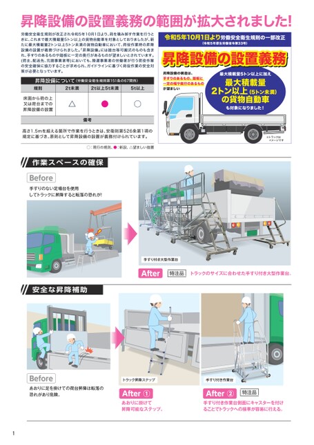 昇降設備の設置義務の範囲が拡大されました!令和5年10月1日より労働安全衛生規則の一部改正(令和5年厚生労働省令第33号)昇降設備の設置義務労働安全衛生規則が改正され令和5年10月1日より、荷を積み卸す作業を行うときに、これまで最大積載量5トン以上の貨物自動車を対象としておりましたが、新たに最大積載量2トン以上5トン未満の貨物自動車において、荷役作業時の昇降設備の設置が義務づけられました。昇降設備」には踏台等可搬式のものも含まれ、手すりのあるものや踏板に一定の奥行があるものが望ましいとされています。(荷主、配送先、元請事業者等)においても、陸運事業者の労働者が行う荷役作業の安全確保に協力することが求められ、ガイドラインに基づく荷役作業の安全対策が必要となっています。昇降設備について(労働安全衛生規則第151条の67関係)規則2t以上5t未満2t未満5t以上床面から荷の上又は荷台までの昇降設備の設置△●○備考高さ1.5mを超える箇所で作業を行うときは、安衛則第526条第1項の規定に基づき、原則として昇降設備の設置が義務付けられています。◯:現行の規則、●:新設、△望ましい措置作業スペースの確保手すりのない足場台を使用してトラックに昇降すると転落の恐れが!昇降設備の構造は、手すりのあるもの、踏板に一定の幅や奥行のあるものが望ましい最大積載量5トン以上に加え2トン以上(5トン未満)最大積載量の貨物自動車も対象になりました!※トラックはイメージです安全な昇降補助トラックのサイズに合わせた手すり付き大型作業台。あおりに足を掛けての荷台昇降は転落の恐れがあり危険。1あおりに掛けて昇降可能なステップ。手すり付き作業台側面にキャスターを付けることでトラックへの接車が容易に行える。
