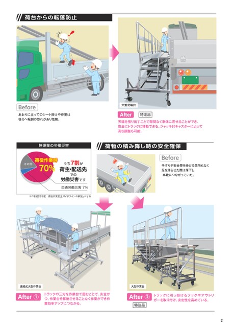 荷台からの転落防止あおりに立ってのシート掛けや作業は後ろへ転倒の恐れがあり危険。天場を張り出すことで間なく車体に寄せることができ、安全にトラックに移動できる。ジャッキ付キャスターによって高さ調整も可能。陸運業の労働災害荷物の積み降し時の安全確保その他荷役作業時70%うち7割がでの荷主・配送先労働災害です交通労働災害7%手すりや安全帯を掛ける箇所もなく足を滑らせた際は落下し事故につながっていた。※「平成25年度荷役作業安全ガイドラインの解説」によるトラックの三方を作業台で囲むことで、安全かつ、作業台を移動させることなく作業ができ作業効率アップにつながる。トラックに引っ掛けるフックやアウトリガーを取り付け、安定性を高めている。2