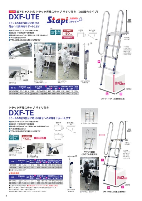 ▶624(669)◀天場寸法/400×427フック内側まで高さ(mm)/DXF-U14TEA:999~1429DXF-U18TEA:1442~1872NEW脚アジャスト式トラック昇降ステップ手すり付き(上部操作タイプ)DXF-UTE(mm)▶170◀支柱形状49踏ざん形状55.327トラックのあおり部分に取付け荷台への昇降をサポートします■折りたたみ式でコンパクトに収納できます■回転スライド収納式手すり標準装備■脚の長さは6mmピッチで調整できます(最大約43cm)■フック内幅寸法63mm■下ろした状態のあおりにも取付けが可能です仕様AH最大使用質量150kg特許登録済▶P◀◀◀約43cm▶(mm)W▶▶◀DDXF-U14TEA(段差設置状態)50DXF-U14TEA上部操作使用イメージDXF-U14TEA使用イメージDXF-U14TEA収納状態▶◀▶◀63(mm)上部操作バーあおりフック型式天場の高さm段数踏ざん間隔mmPDXF-U14TEA1.02~1.45DXF-U18TEA1.47~1.9046328(上段のみ326)上3段282、下2段299昇降面437437設置寸法mm奥行WD723~855859~990保管収納寸法mm奥行長さ12351701701630幅540540質量kg11.413.7▶622(667)◀天場寸法/400×427フック内側まで高さ(mm)/DXF-14TEA:999~1429DXF-18TEA:1442~1872▶P◀◀設置寸法mm奥行WD723〜855859〜990昇降面435435質量kg保管収納寸法mm長さ奥行16511.21235163016513.5幅540540型式天場の高さm段数P踏ざん間隔mmDXF-14TEADXF-18TEA1.02〜1.451.47〜1.90●天場寸法(㎜)400×42746317283★受注生産品型式天場の高さm段数P踏ざん間隔mm設置寸法mm奥行WD昇降面435435保管収納寸法mm奥行長さ16512351630165幅540540463172831.02〜1.451.47〜1.90DXF-S14TEADXF-S18TEA●天場寸法(㎜)160×427●天場奥行をコンパクトにした事で、軽量化を実現●トラック(積荷)と手すりの隙間を減らし側面からの転落防止を向上させました※手すりを反転して使用する事はできません※連結足場板(DXF-ST※※)のオプションは取付けできません483〜615619〜750質量kg10.012.3DXF-14TEA収納状態約43cm▶(mm)◀▶▶◀DWDXF-14TEA使用イメージDXF-14TEA(段差設置状態)3手すりをたたんで収納可能(mm)◀▶踏ざん形状55.34826.5トラックのあおり部分に取付け荷台への昇降をサポートします■折りたたみ式でコンパクトに収納できます■回転スライド収納式手すり標準装備■脚の長さは25mmピッチで調整できます(最大約43cm)■フック内幅寸法63mm■下ろした状態のあおりにも取付けが可能です支柱形状DXF-14TEA2749DXF-18TEA仕様AH最大使用質量150kg特許登録済トラック昇降ステップ手すり付きDXF-TE50手すりロックは指1本で操作可能伸縮操作レバー▶165◀手すりを裏表どちらでも設置可能▶◀▶◀63(mm)あおりフック