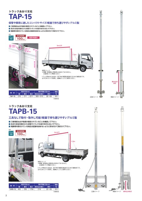 ▶挟み込み高さ◀正面イメージ側面イメージトラックあおり支柱TAP-15保管や積荷に適したコンパクトサイズ!軽量で持ち運びやすいアルミ製■ご使用前は必ず各部が固定されていることを確認して下さい。■あおり支柱を取付けた状態でトラックの走行を行わないで下さい。■電飾等を取付けている場合は配線を挟まないように気を付けて取付けて下さい。3m以下◀▶◀1.5m▶使用イメージ※親綱・墜落制止用器具は含まれておりません。お客様にてご準備ください。トラック用あおり支柱は、落下時の衝撃を軽減するための補助具です。必ず2本セットで使用し、親綱は1人でご使用ください。厚み挟み込み高さ上部フック(あおりに引っ掛ける)仕様A最大使用質量100kg固定(右回り)解除(左回り)特許申請中固定(左回り)解除(右回り)調整ナット固定(上方向)解除(下方向)外形寸法mm幅210奥行211高さ2211型式TAP-15取付可能寸法mm厚み挟み込み高さ300〜51030〜60質量kg8.6※運賃別途使用イメージ※親綱・墜落制止用器具は含まれておりません。お客様にてご準備ください。トラック用あおり支柱は、落下時の衝撃を軽減するための補助具です。必ず2本セットで使用し、親綱は1人でご使用ください。▶取付可能寸法mm厚み挟み込み高さ21920〜65質量kg8.9※運賃別途正面イメージ側面イメージ◀挟み込み高さ挟み込み高さあおりに引っ掛ける厚み固定解除(右回り)(左回り)外形寸法mm幅455奥行255高さ1759型式TAPB-157トラックあおり支柱TAPB-15工具なしで取付・取外し可能!軽量で持ち運びやすいアルミ製■ご使用前は必ず各部が固定されていることを確認して下さい。■あおり支柱を取付けた状態でトラックの走行を行わないで下さい。■電飾等を取付けている場合は配線を挟まないように気を付けて取付けて下さい。仕様A最大使用質量100kg3m以下▶▶◀1.5m◀
