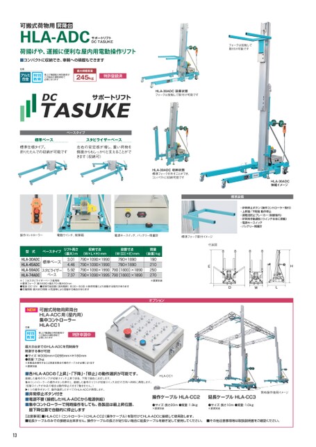 可搬式荷物用昇降台HLA-ADCサポートリフトDCTASUKE荷揚げや、運搬に便利な屋内用電動操作リフト■コンパクトに収納でき、車輌への積載もできます仕様AO 巻上げ機運転の特別教育がこの製品の運転資格で必要となります最大積載質量245kg特許登録済HLA-30ADC設置状態フォークは反転して取付け可能ですベースタイプ標準ベース標準仕様タイプ。折りたたんでの収納が可能ですスタビライザーベース左右の安定感が増し、重い荷物を側面からもしっかりと支えることができます(収納可)HLA-30ADC収納状態標準フォークを外すことができ、コンパクトに収納可能です操作コントローラー電動ウインチ、制御箱電源キースイッチ、バッテリー残量計標準フォーク取付イメージフォークは反転して取付け可能ですHLA-30ADC伸縮イメージ標準装備・非常停止ボタン(操作コントローラー取付)・上昇端/下降端動作停止・過電流防止ブレーカー(制御箱内)・非常時手動運転(ウインチ本体に搭載)・電源キースイッチ・バッテリー残量計寸法図EEHHDDWWLL同時操作使用イメージ延長ケーブルHLA-CC3●サイズ:長さ10m●質量:1.0kg※運賃別途■各HLA-ADCの「上昇」・「下降」・「停止」の動作選択が可能です。接続した番号のランプが切替スイッチ上昇で赤色、下降で緑色に点灯します。集中コントローラーの操作ボタンを押すと、接続した番号のリフトが切替スイッチ点灯の方向へ同時に昇降します。HLA-CC1(切替スイッチが中央の場合は動作停止のままで動きません。)▶1つの操作ボタンで、動作選択したすべてのHLA-ADCが昇降します。■非常停止ボタン付き■電源不要(接続したHLA-ADCから電源供給)■集中コントローラーで同時操作をしても、各製品は最上昇位置、最下降位置で自動的に停止します【注意事項】■HLA-CC1(コントローラー)にHLA-CC2(操作ケーブル)を取付けてHLA-ADCに接続して使用致します。●サイズ:長さ20m●質量:1.9kg※運賃別途操作ケーブルHLA-CC2■延長ケーブルのみでの接続は出来ません。操作ケーブルの長さが足りない場合に延長ケーブルを継ぎ足して使用してください。■その他注意事項等は取扱説明書をご確認ください。190210250270※運賃別途オプション型式ベースタイプリフト高さ(最大)mHLA-30ADCHLA-45ADCHLA-59ADCHLA-74ADC標準ベーススタビライザーベース3.014.465.927.37収納寸法(W×L×H)mm790×1090×1990790×1090×1990790×1090×1990790×1090×1995790×1890790×1890790[1800]×1890790[1800]×1890設置寸法(W[D]×E)mm質量(自重)kg※[]はスタビライザーベース使用時※標準フォーク:奥行690×幅570×厚み50mm●電源:DC12V●昇降可能回数(満充電時):約30〜50回※負荷荷重により変動する場合があります●充電時間:最大約5時間※気温等により変動する場合がありますNEW仕様可搬式荷物用昇降台HLA-ADC用(屋内用)集中コントローラーHLA-CC1O 巻上げ機運転の特別教育がこの製品の運転資格で必要となります特許申請中最大8台までのHLA-ADCを同時操作制御する事が可能●サイズ:W330mm×D265mm×H180mm●質量:7.2kg※本製品を操作するには別途台数分の操作ケーブルが必要になります※運賃別途13
