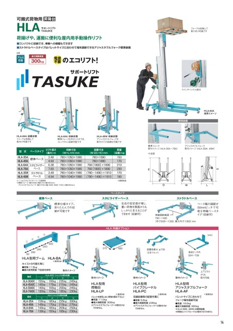 可搬式荷物用昇降台HLAサポートリフトTASUKE荷揚げや、運搬に便利な屋内用手動操作リフト■コンパクトに収納でき、車輌への積載もできます■ストラドルベースタイプはパレットサイズに合わせて幅を調節できるアジャスタブルフォーク標準装備仕様A最大積載質量300kgフォークは反転して取り付け可能ですウインチハンドル部分HLA-64A使用イメージ標準装備HLA-64A設置状態フォークは反転して取付け可能ですHLA-64A収納状態標準フォークを外すことができ、コンパクトに収納可能ですHLA-49W収納状態アジャスタブルフォークを取付けての収納も可能です型式ベースタイプHLA-35AHLA-49AHLA-64AHLA-78AHLA-35WHLA-49W標準ベーススタビライザーベースストラドルベースリフト高さ(最大)m3.484.936.387.833.494.94収納寸法(W×L×H)mm790×1050×1990790×1050×1990790×1050×1990790×1050×1995790×1040×1990790×1040×1990※[]はスタビライザーベース使用時※標準フォーク:奥行690×幅570×厚み50mmアジャスタブルフォーク:奥行700×幅(555・665・740)×厚み60mm設置寸法(W[D]×E)mm質量(自重)kg790×1890790×1890790[1800]×1890790[1800]×1890(790〜1490)×1910(790〜1490)×1910150170210230170190※運賃別途標準フォーク取付イメージ(HLA-35A~78A)アジャスタブルフォーク取付イメージ(HLA-35W、49W)寸法図EHDWL標準ベース標準仕様タイプ。折りたたんでの収納が可能です④400200③②200200①50HLA型用ブームHLA-BAホイストの代替え等に●質量:11.5kg●最大使用質量:下記表を参照※運賃別途取付イメージHLA-ADCシャックル取付位置型式HLA-30ADCHLA-45ADCHLA-59ADCHLA-74ADC型式HLA-35AHLA-49AHLA-64AHLA-78A①155㎏145㎏140㎏130㎏①155kg145kg140kg130kg②185㎏175㎏165㎏155㎏②185kg175kg165kg155kg③235㎏215㎏200㎏185㎏③235kg215kg200kg185kgHLAシャックル取付位置④245kg245kg245kg230㎏④300kg275kg250kg230kgベースタイプスタビライザーベース左右の安定感が増し、重い荷物を側面からもしっかりと支えることができます(収納可)HLA共通オプションストラドルベースベース幅の調節が50mmピッチで可能な伸縮ベースタイプ(収納可)▶◀伸縮調節範囲790~1490(内寸600~1300、最大内寸1300)mm570680設置径最大:φ735(2本1セット)取付イメージ取付イメージ取付イメージ(mm)指定ピッチ内554~739上下どちらからも取付可能HLA型用荷物台HLA-LP※運賃別途パレットを使用しない荷物の積み下ろしに●質量:11.0kg●最大積載質量:300kg※アジャスタブルフォークへの取付けはできませんHLA型用パイプクレードルHLA-PC空調設備等の配管作業に●質量:5.5kg●最大積載質量:235kg※アジャスタブルフォークへの取付けは※運賃別途できませんHLA型用アジャスタブルフォークHLA-AFパレットサイズに合わせてフォーク幅を調節可能●質量:18.0kg●最大積載質量:300kg※HLA-35W、49Wには標準装備※荷物台とパイプクレードルの取付けはできません※運賃別途14