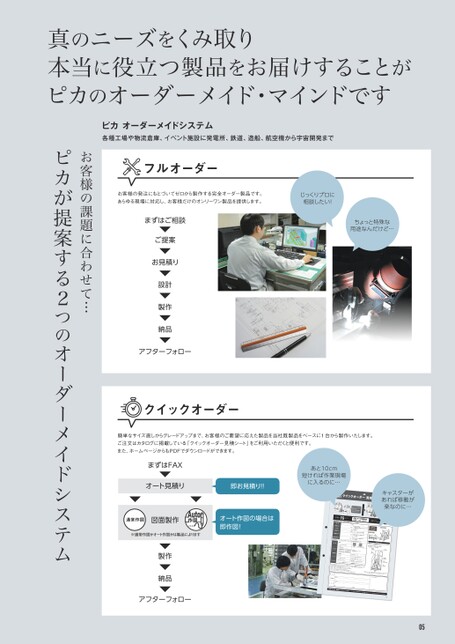 真のニーズをくみ取り本当に役立つ製品をお届けすることがピカのオーダーメイド・マインドですキャスターがあれば移動が1台より特注製作します楽なのに…設置スペースや足場の高さに対してピッタリ製作できますクイックオーダー見積シートお客様のご要望に合わせて隙間なくピタリ◀▶◀段差なくピッリクイックオーダーなら標準サイズでは幅や高さが足りない…足場との間に隙間や段差ができてしまう…◀▶▶◀作業台FGタイプ■お見積に必要な事項を太枠内に記入してください数量Aut作図オート作図対応※溶接一体型のみ天場高さ(H段数正面幅(W)天場奥行(D1)踏ざん奥行D2)台mm※180〜210mm200m以上の場合は、ず手すり・巾木が必要です段mmmm※8段以下※20〜200m(1mm間隔)※200250mm標準400m)(1mm間隔)必要な事項に□チェクを入れてください。チェックがない場合は通常仕様となます□縞板mm※20〜50mm標準200mm)(10m間)踏面車輪背面車輪ベースアジャスター□ノンスリププレス加工□自在車輪4個□〈前〉自在車輪2個〈後〉固定車輪2個□〈前〉定車輪2個〈後〉自在車輪2□背面車輪□ベース板□ベース板&ベースゴム□アジャスターFG-AJ)□アジャスター支柱外付けタイプ)縞板ノンスリップレス加工※100(自在車輪はスッパー付)※φ102コ/セッ)※10×10mm4枚/セッ)※10100m(4枚セット)※調節範囲0〜45m(4/セット)※調節範囲0〜8mm4コ/セット)※全高150mm以下、面幅100mm以下天場奥行100m以下、設置部奥行120m以下の場合は最大使用質量15kになりす。こより大きいサイズについて最大使用質量は12kgなりす※2段以上の踏ざ間隔は自動的に等分されサイズになます※溶接一体型になりすが、組式タイプもご望に応じて製作しす※溶接一体型はアルイト仕上げ無の仕様となりす※手すりき、その他下記以外の仕様もご希望に応て製作します※オション取付け条件によっては、イッオーダー象外となる場合があます貴社名フリガナご担当者様ご住 所フリガナ〒(ー)TE▶組立式タイプもご希望に応じて製作しますご希望によりステンレス様も製作可能す1段D奥行W正幅D2奥行H天場高最大使用質量150kg2段以上D1奥行W正幅H天さ手すりオーダー必要な手すり該当箇所に□チェックを入れてください下記手すりラスト外の手すり製作致しす手すり高さをご指定ください(φ32)□90mm□110mm□天場面手す()□階手すり左)□背面手す□天側面手り右)□巾木(高15m)□階段手り右)※木にチェッを入れた場合、場手すりのある所全てに巾木が付きす手すりの無い箇所及び階段手すには巾木を付ることはできませんその他特記事項FA最寄りの支店・営業所にFAXしてください。FA番号および送信面をもう一度ご確認願います。ームページからもPDFダウンロードができます。105ピカオーダーメイドシステム各種工場や物流倉庫、イベント施設に発電所、鉄道、造船、航空機から宇宙開発までフルオーダーお客様の発注にもとづいてゼロから製作する完全オーダー製品です。あらゆる現場に対応し、お客様だけのオンリーワン製品を提供します。じっくりプロに相談したい!まずはご相談ご提案お見積り設計製作納品アフターフォローちょっと特殊な用途なんだけど…クイックオーダー簡単なサイズ直しからグレードアップまで、お客様のご要望に応えた製品を当社既製品をベースに1台から製作いたします。ご注文はカタログに掲載している「クイックオーダー見積シート」をご利用いただくと便利です。また、ホームページからもPDFでダウンロードができます。まずはFAXオート見積り即お見積り!!あと10cm短ければ作業現場に入るのに…キリトリ通常作図図面製作※通常作図かオート作図かは製品によりますオート作図の場合は即作図!製作納品アフターフォローお客様の課題に合わせて…ピカが提案する2つのオーダーメイドシステム