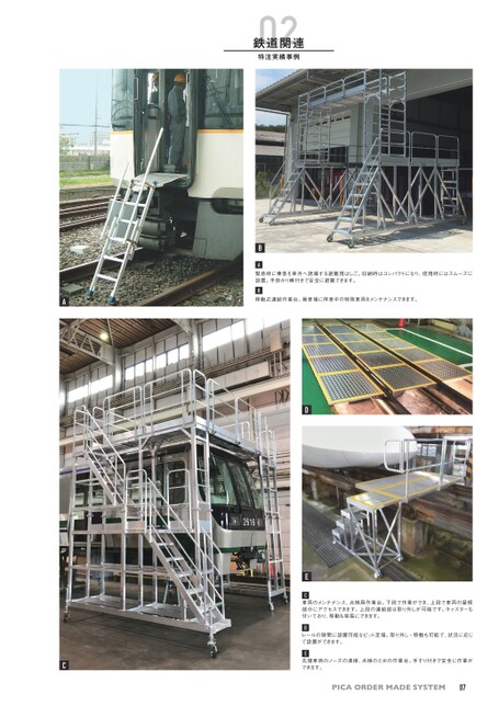 PICAORDERMADESYSTEM02鉄道関連特注実績事例BA緊急時に乗客を車外へ誘導する避難用はしご。収納時はコンパクトになり、使用時にはスムーズに設置。手掛かり棒付きで安全に避難できます。B移動式連結作業台。操車場に停車中の特殊車両をメンテナンスできます。DEC車両のメンテナンス、点検用作業台。下段で作業ができ、上段で車両の屋根部分にアクセスできます。上段の連結部は取り外しが可能です。キャスターも付いており、移動も容易にできます。Dレールの隙間に設置可能なピット足場。取り外し・移動も可能で、状況に応じて設置ができます。E先頭車両のノーズの清掃、点検のための作業台。手すり付きで安全に作業ができます。07AC