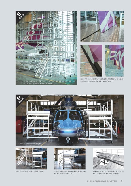 PICAORDERMADESYSTEMアルミ製なので鋼製に比べ軽量です。キャスター付きで機体位置に合わせて移動させることができ、人の力で微調整も可能な点検用足場。足場をスライドさせる機構により、垂直尾翼との隙間をより少なく、機体にフィットさせることで、安全に作業することができます。ヘリコプタープロペラの点検用作業台。2PICKUP0ステップにも手すりをつけ安全に昇降できます。エンジン点検のため、後ろ側は機体の形状に合わせてオーバーハングさせています。天場からオーバーハングさせた作業台をとりつけることで、より奥側まで点検が可能になりました。091PICKUP0