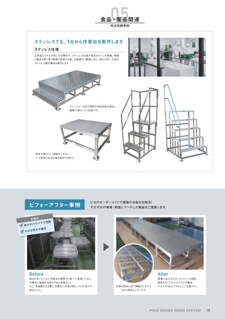 PICAORDERMADESYSTEM05特注実績事例食品・薬品関連ステンレスでも、1台から作業台を製作しますステンレス仕様沿岸部などサビが気になる場所や、ステンレス仕様が規定されている現場、特殊な薬品を取り扱う現場で使用する等、お客様のご要望に応じ、様々な形・寸法のステンレス製作業台を製作します。クリーンルーム内で使用する低床型作業台。縞板で滑りにくい仕様です。粉末が残りにくく掃除がしやすいドット型滑り止め仕様も製作できます。ビフォーアフター事例ピカのオーダーメイドで現場のお悩みを解決!それぞれの現場・用途にマッチした製品をご提案します。Before高さがあっていない作業台を無理やり並べて使用しており、作業中に転倒する恐れがあり危険でした。また、床掃除をする際に作業台に水滴が残り、カビが生え不衛生でした。After現場に合わせたぴったりフィット設計。段差もなくフラットなアルミ作業台。アルマイト加工でサビにくい仕様です。天板は取外し式で掃除がしやすくカビが発生しにくいです11