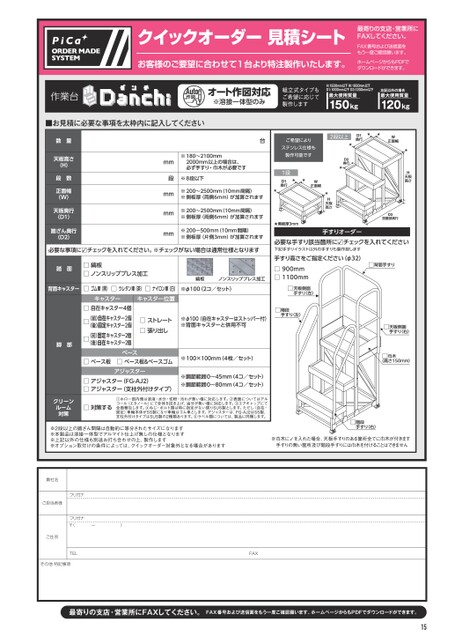 最寄りの支店・営業所にFAXしてください。FAX番号および送信面をもう一度ご確認願います。ホームページからもPDFでダウンロードができます。クイックオーダー見積シート最寄りの支店・営業所にFAXしてください。FAX番号および送信面をもう一度ご確認願います。お客様のご要望に合わせて1台より特注製作いたします。ホームページからもPDFでダウンロードができます。貴社名フリガナご担当者様フリガナ〒(ー)ご住 所TELその他 特記事項FAX15