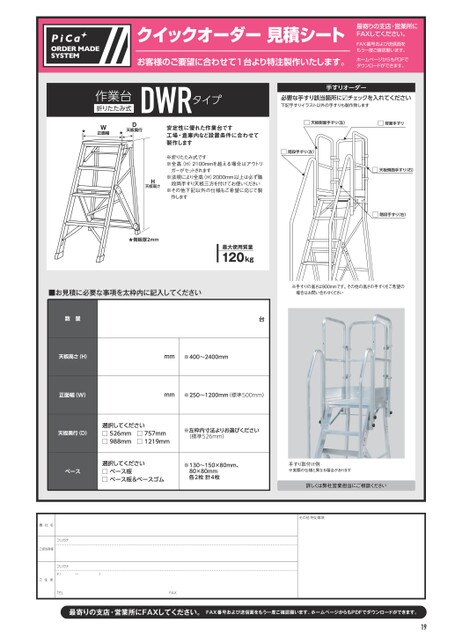 最寄りの支店・営業所にFAXしてください。FAX番号および送信面をもう一度ご確認願います。ホームページからもPDFでダウンロードができます。クイックオーダー見積シート最寄りの支店・営業所にFAXしてください。FAX番号および送信面をもう一度ご確認願います。お客様のご要望に合わせて1台より特注製作いたします。ホームページからもPDFでダウンロードができます。貴社名ご担当者様フリガナフリガナ〒(ー)ご住 所TELFAXその他 特記事項19