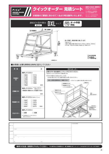 最寄りの支店・営業所にFAXしてください。FAX番号および送信面をもう一度ご確認願います。ホームページからもPDFでダウンロードができます。クイックオーダー見積シート最寄りの支店・営業所にFAXしてください。FAX番号および送信面をもう一度ご確認願います。お客様のご要望に合わせて1台より特注製作いたします。ホームページからもPDFでダウンロードができます。貴社名ご担当者様フリガナフリガナ〒(ー)ご住 所TELFAXその他 特記事項21