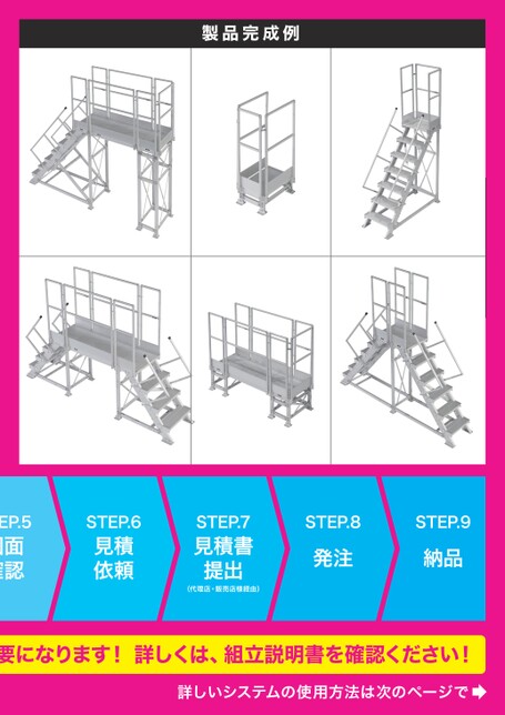 製品完成例EP.5図面確認STEP.6見積依頼STEP.7見積書提出(代理店・販売店様経由)STEP.8発注STEP.9納品要になります!詳しくは、組立説明書を確認ください!詳しいシステムの使用方法は次のページで
