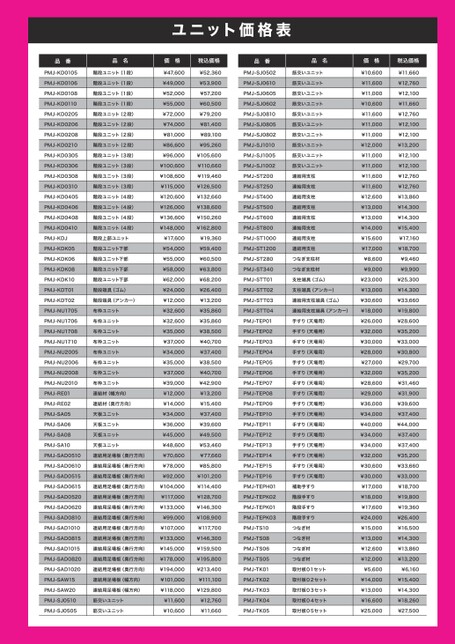 ユニット価格表PMJ-KD0105PMJ-KD0106PMJ-KD0108PMJ-KD0110PMJ-KD0205PMJ-KD0206PMJ-KD0208PMJ-KD0210PMJ-KD0305PMJ-KD0306PMJ-KD0308PMJ-KD0310PMJ-KD0405PMJ-KD0406PMJ-KD0408PMJ-KD0410PMJ-KDJPMJ-KDK05PMJ-KDK06PMJ-KDK08PMJ-KDK10PMJ-KDT01PMJ-KDT02PMJ-NU1705PMJ-NU1706PMJ-NU1708PMJ-NU1710PMJ-NU2005PMJ-NU2006PMJ-NU2008PMJ-NU2010PMJ-RE01PMJ-RE02PMJ-SA05PMJ-SA06PMJ-SA08PMJ-SA10PMJ-SAD0510PMJ-SAD0610PMJ-SAD0515PMJ-SAD0615PMJ-SAD0520PMJ-SAD0620PMJ-SAD0810PMJ-SAD1010PMJ-SAD0815PMJ-SAD1015PMJ-SAD0820PMJ-SAD1020PMJ-SAW15PMJ-SAW20PMJ-SJ0510PMJ-SJ0505階段ユニット(1段)階段ユニット(1段)階段ユニット(1段)階段ユニット(1段)階段ユニット(2段)階段ユニット(2段)階段ユニット(2段)階段ユニット(2段)階段ユニット(3段)階段ユニット(3段)階段ユニット(3段)階段ユニット(3段)階段ユニット(4段)階段ユニット(4段)階段ユニット(4段)階段ユニット(4段)階段上部ユニット階段ユニット下部階段ユニット下部階段ユニット下部階段ユニット下部階段端具(ゴム)階段端具(アンカー)布枠ユニット布枠ユニット布枠ユニット布枠ユニット布枠ユニット布枠ユニット布枠ユニット布枠ユニット連結材(幅方向)連結材(奥行方向)天板ユニット天板ユニット天板ユニット天板ユニット連結用足場板(奥行方向)連結用足場板(奥行方向)連結用足場板(奥行方向)連結用足場板(奥行方向)連結用足場板(奥行方向)連結用足場板(奥行方向)連結用足場板(奥行方向)連結用足場板(奥行方向)連結用足場板(奥行方向)連結用足場板(奥行方向)連結用足場板(奥行方向)連結用足場板(奥行方向)連結用足場板(幅方向)連結用足場板(幅方向)筋交いユニット筋交いユニット¥47,600¥49,000¥52,000¥55,000¥72,000¥74,000¥81,000¥86,600¥96,000¥100,600¥108,600¥115,000¥120,600¥126,000¥136,600¥148,000¥17,600¥54,000¥55,000¥58,000¥62,000¥24,000¥12,000¥32,600¥32,600¥35,000¥37,000¥34,000¥35,000¥37,000¥39,000¥12,000¥14,000¥34,000¥36,000¥45,000¥48,600¥70,600¥78,000¥92,000¥104,000¥117,000¥133,000¥99,000¥107,000¥133,000¥145,000¥178,000¥194,000¥101,000¥118,000¥11,600¥10,600¥52,360¥53,900¥57,200¥60,500¥79,200¥81,400¥89,100¥95,260¥105,600¥110,660¥119,460¥126,500¥132,660¥138,600¥150,260¥162,800¥19,360¥59,400¥60,500¥63,800¥68,200¥26,400¥13,200¥35,860¥35,860¥38,500¥40,700¥37,400¥38,500¥40,700¥42,900¥13,200¥15,400¥37,400¥39,600¥49,500¥53,460¥77,660¥85,800¥101,200¥114,400¥128,700¥146,300¥108,900¥117,700¥146,300¥159,500¥195,800¥213,400¥111,100¥129,800¥12,760¥11,660¥10,600¥11,600¥11,000¥10,600¥11,600¥11,000¥11,000¥12,000¥11,000¥11,000¥11,600¥11,600¥12,600¥13,000¥13,000¥14,000¥15,600¥17,000¥8,600¥9,000¥23,000¥13,000¥30,600¥18,000¥26,000¥32,000¥30,000¥28,000¥27,000¥32,000¥28,600¥29,000¥36,000¥34,000¥40,000¥34,000¥34,000¥32,000¥30,600¥30,000¥17,000¥18,000¥17,600¥24,000¥15,000¥13,000¥12,600¥12,000¥5,600¥14,000¥13,000¥16,600¥25,000¥11,660¥12,760¥12,100¥11,660¥12,760¥12,100¥12,100¥13,200¥12,100¥12,100¥12,760¥12,760¥13,860¥14,300¥14,300¥15,400¥17,160¥18,700¥9,460¥9,900¥25,300¥14,300¥33,660¥19,800¥28,600¥35,200¥33,000¥30,800¥29,700¥35,200¥31,460¥31,900¥39,600¥37,400¥44,000¥37,400¥37,400¥35,200¥33,660¥33,000¥18,700¥19,800¥19,360¥26,400¥16,500¥14,300¥13,860¥13,200¥6,160¥15,400¥14,300¥18,260¥27,500PMJ-SJ0502PMJ-SJ0610PMJ-SJ0605PMJ-SJ0602PMJ-SJ0810PMJ-SJ0805PMJ-SJ0802PMJ-SJ1010PMJ-SJ1005PMJ-SJ1002PMJ-ST200PMJ-ST250PMJ-ST400PMJ-ST500PMJ-ST600PMJ-ST800PMJ-ST1000PMJ-ST1200PMJ-ST280PMJ-ST340PMJ-STT01PMJ-STT02PMJ-STT03PMJ-STT04PMJ-TEP01PMJ-TEP02PMJ-TEP03PMJ-TEP04PMJ-TEP05PMJ-TEP06PMJ-TEP07PMJ-TEP08PMJ-TEP09PMJ-TEP10PMJ-TEP11PMJ-TEP12PMJ-TEP13PMJ-TEP14PMJ-TEP15PMJ-TEP16PMJ-TEPH01PMJ-TEPK02PMJ-TEPK01PMJ-TEPK03PMJ-TS10PMJ-TS08PMJ-TS06PMJ-TS05PMJ-TK01PMJ-TK02PMJ-TK03PMJ-TK04PMJ-TK05筋交いユニット筋交いユニット筋交いユニット筋交いユニット筋交いユニット筋交いユニット筋交いユニット筋交いユニット筋交いユニット筋交いユニット連結用支柱連結用支柱連結用支柱連結用支柱連結用支柱連結用支柱連結用支柱連結用支柱つなぎ支柱材つなぎ支柱材支柱端具(ゴム)支柱端具(アンカー)連結用支柱端具(ゴム)連結用支柱端具(アンカー)手すり(天場用)手すり(天場用)手すり(天場用)手すり(天場用)手すり(天場用)手すり(天場用)手すり(天場用)手すり(天場用)手すり(天場用)手すり(天場用)手すり(天場用)手すり(天場用)手すり(天場用)手すり(天場用)手すり(天場用)手すり(天場用)補助手すり階段手すり階段手すり階段手すりつなぎ材つなぎ材つなぎ材つなぎ材取付板01セット取付板02セット取付板03セット取付板04セット取付板05セット品番品名価格税込価格品番品名価格税込価格