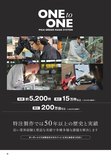 年間約5,200件累計15万件以上累計200万台以上※2002年以降調べ※2010年以降調べ特注製作では50年以上の歴史と実績長い業界経験と豊富な実績で多種多様な課題を解決しますオーダーメイドは特注のエキスパートピカにお任せください02