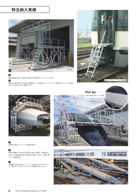 PICAORDERMADESYSTEM特注納入実績AA▶p.06ビフォーアフター事例掲載移動式連結作業台。操車場に停車中の特殊車両をメンテナンスできます。B緊急時に乗客を車外へ誘導する避難用はしご。収納時はコンパクトになり、使用時にはスムーズに設置。手掛かり棒付きで安全に避難できます。B▶p.06ビフォーアフター事例掲載PickUp天板は縞板で滑りにくい仕様。CC新幹線の車両メンテナンス・清掃用作業台。D車両の前面ガラス部分を洗浄する為の作業台。洗浄部分に合わせて作業足場の高さを変更する事ができます。天板は滑りにくい縞板仕様。E清掃機材を台車に載せて、ホームから地面に降ろす為のスロープ。木製スロープをアルミ化することで耐食性が向上しました。DE04