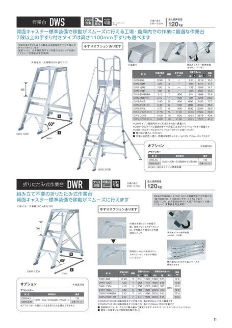 天場の高さが2m以上の製品には階段両手すり天場三方がセットされています法規*により、必ず階段両手すり天場三方を付けてお使いください(*労働安全衛生規則)手すりオプションあります天場寸法/正面幅500×奥行520天場部分背面キャスター標準装備(φ100、ゴム製)W質量kgD型式天場の高さm段数手すり高さmm設置寸法mm幅631683736788841841189018901930193019831983奥行121914131608180219961996219021902384238425792579――――90011009001100900110090011000.901.201.501.802.102.102.402.402.702.703.003.00DWS-90BDWS-120BDWS-150BDWS-180BDWS-210B09HDWS-210B11HDWS-240BDWS-240B11HDWS-270BDWS-270B11HDWS-300BDWS-300B11H※210タイプは階段両手すり天場三方付きの質量です※240〜300タイプは階段両手すり天場三方及びアウトリガー付きの質量です※240〜300タイプは必ずアウトリガーを付けてお使いください●幅の広い踏ざん(107mm)●天場は安定性に優れ、移動は背面キャスター(φ100)でスムーズに行えます3456778899101010.011.714.716.325.926.937.038.038.839.840.641.6◀DWS-120B◀(mm)▶▶WD▶◀300背面キャスター標準装備で移動がスムーズに行える工場・倉庫内での作業に最適な作業台7段以上の手すり付きタイプは高さ1100mm手すりも選べます作業台DWSAFM※クイックオーダー対応品天場の高さ:0.90〜3.00m最大使用質量120kgDWS-240BAHM天場の高さ:0.90〜2.10m折りたたみ式作業台DWR組み立て不要の折りたたみ式作業台背面キャスター標準装備で移動がスムーズに行えます天場寸法/正面幅500×奥行526手すりオプションありますオプションアウトリガー型式DWS-AUDWS-AUS適用型式DWS-120B〜210B09H・210B11H※240〜300タイプには標準装備※運賃別途備考1本2本/セット最大使用質量120kgDWR-210A09H、210A11Hには階段両手すり天場三方(高さ900mm、1100mm)がセットされています法規*により、必ず階段両手すり天場三方を付けてお使いください(*労働安全衛生規則)11作業台を開くだけで使用可能。従来のようなわずらわしいロック作業が不要なので作業効率もアップ背面キャスター標準装備(φ100、ゴム製)▶使用前には止め金具がロックされていることを必ず確認してください積み重ねられるので省スペースで保管できます型式天場の高さm段数DWR‐90ADWR‐120ADWR‐150ADWR‐180ADWR-210A09HDWR-210A11H0.901.201.501.802.102.10345677設置寸法mm保管収納寸法mmW幅631683736788841841D奥行122014131607180219961996長さ139016901990229026352635幅635685740790845845奥行335質量kg12.213.816.818.532.433.5※DWR-210A09Hは階段両手すり天場三方(高さ900mm)付きの質量です※DWR-210A11Hは階段両手すり天場三方(高さ1100mm)付きの質量です●収納時はフラットになるので積み重ねて保管できます※手すりをつけたままでは折りたたみできません●筋交いの変更により安定感を高めました◀DWR‐120A◀(mm)オプションアウトリガー型式DWS-AUDWS-AUS適用型式DWR-120A〜210A09H・210A11H▶▶WD※運賃別途備考1本2本/セット※アウトリガーを取付けたまま折りたたむ事はできません▶◀300