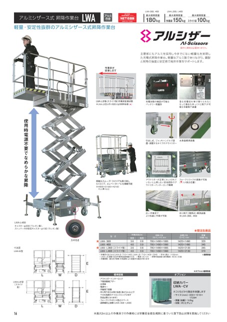 アルミシザース式昇降作業台LWAA軽量・安定性抜群のアルミシザース式昇降作業台LWA-36B、46B最大使用質量180kgLWA-L36B、L46B最大使用質量作業床150kg最大使用質量スライド床100kg操作に資格は必要ありません主要部にもアルミを採用し今までにない軽量化を実現した充電式昇降作業台。軽量なアルミ製でありながら、鋼製と同等の強度と安定感で高所作業をサポートします。作業床が拡張しますLWA-LB型(スライド型)作業床拡張状態※LWA-LB型は吊り用受け金具標準装備(▲)充電状態の確認が可能なバッテリー残量計急な充電切れ等で降りられなくなった場合もゆっくりと降下が可能な手動降下装置引出し式、ジャッキハンドルで設置・調整するタイプのアウトリガー水準器標準装備移動もスムーズ!ひとりでも取り回しらくらくで、エレベーター※にも積載可能※W900×D1500×H210015人乗り以上アウトリガーが正常にセットされていないと上昇しない安全設計のアウトリガーインターロック機構フォークリフトでの運搬が可能(▼ツメ差込位置)広い作業床でより快適に作業が可能吊り用穴(開閉式)標準装備※LWA-36B、46B★受注生産品質量(自重)kg320345345370※運賃別途設置寸法(D×E)mm1420×14901420×14901420×21301420×2130収納寸法(W×L×H)mm795×1490×1885795×1490×1990795×1490×1885795×1490×1990作業床高さm伸長3.64.63.64.6縮長0.80.90.80.9型式LWA‐36BLWA‐46BLWA‐L36B(スライド型)LWA‐L46B(スライド型)★★⃝作業床寸法(mm)LWA-B:710×1400、LWA-LB:710×1400〜2049⃝手すり高さ:1100mm⃝LWA-LB設置寸法は作業床拡張時最大寸法⃝電源:DC12V⃝昇降可能回数(満充電時):約30~50回⃝充電時間:最大約7時間※気温等により変動する場合があります※オプション運賃別途オプションコリなどから製品を保護します⃝サイズ(mm):830×1510×収納カバーLWA‐CVホ1720H⃝質量(自重):3.0kg⃝材質:ポリエチレン標準装備・アウトリガーインターロック・下降時警報ブザー・水準器・電源キー・手動降下装置・吊り用穴または受け金具(長さ5m以上で十分な強度のナイロンスリング2本が別途必要となります)・フォークリフトのツメ差込スペース・過積載防止装置(LWA-46B・L46B)※高さ2m以上の作業床での作業時には労働安全衛生規則に基づいた落下防止対策を実施してくださいLWA-L46Bキャスターφ200(ウレタン製)、ストッパー付き自在キャスターφ150(ウレタン製)カギ付きHHWDWDLLEE寸法図LWA-B型LWA-LB型(スライド型)16使用時電源不要でなめらかな昇降