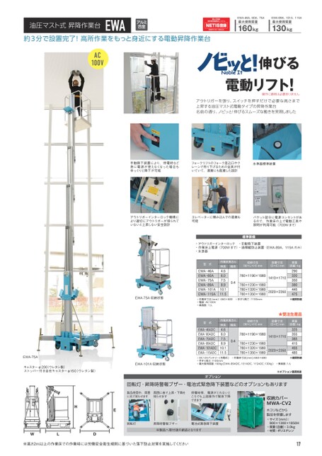油圧マスト式昇降作業台EWAA約3分で設置完了!高所作業をもっと身近にする電動昇降作業台EWA-46A、60A、75A最大使用質量160kgEWA-89A、101A、115A最大使用質量130kgAC100V伸びる電動リフト!操作に資格は必要ありませんアウトリガーを張り、スイッチを押すだけで必要な高さまで上昇する油圧マスト式電動タイプの昇降作業台名前の通り、ノビッと!伸びるスムーズな動きを実現しました手動降下装置により、停電時など急に電源が使えなくなった場合もゆっくりと降下が可能フォークリフトのフォーク差込口やクレーンで吊り下げるための金具が付いていて、運搬にも配慮した設計水準器標準装備アウトリガーインターロック機構により適切にアウトリガーが張られていないと上昇しない安全設計エレベーターに積み込んでの運搬も可能バケット部分に電源コンセントがあるので、作業床の上で電動工具や照明が利用可能(700Wまで)標準装備・アウトリガーインターロック・・水準器作業床上電源(700Wまで)・手動降下装置・過積載防止装置(EWA-89A、115Aのみ)EWA-75A収納状態EWA-101A収納状態290320350380445475※運賃別途325355385415455485※運賃別途収納寸法(W×L×H)mm設置寸法(D×E)mm質量(自重)kg780×1190×1980780×1230×1980780×1320×1980780×1350×19801410×17102020×2350⃝作業床寸法(mm):660×680⃝手すり高さ:1100mm⃝電源:AC100V⃝乗員数:1人型式EWA‐46AEWA‐60AEWA‐75AEWA‐89AEWA‐101AEWA‐115A作業床高さm伸長縮長4.66.07.58.910.111.50.4型式EWA‐46ADCEWA‐60ADCEWA‐75ADCEWA‐89ADCEWA‐101ADCEWA‐115ADC作業床高さm伸長縮長4.66.07.58.910.111.50.4★受注生産品収納寸法(W×L×H)mm設置寸法(D×E)mm質量(自重)kg780×1190×19801410×1710780×1230×1980780×1320×1980780×1350×1980⃝DC12Vバッテリ―(充電式)⃝作業床寸法(mm):660×680⃝手すり高さ:1100mm⃝最大使用質量:160㎏(EWA-89ADC、101ADC、115ADC:130㎏)⃝乗員数:1人2020×2350EWA-75Aキャスターφ200ウレタン製)ストッパー付き自在キャスターφ150(ウレタン製)回転灯・昇降時警報ブザー・電池式緊急降下装置などのオプションもありますオプション※オプション運賃別途製品使用中、周囲に光で知らせます周囲に音で上昇・下降を知らせます停電時等、電源がとれないところでも上部操作で緊急下降できますHEWLD回転灯昇降時警報ブザー電池式緊急降下装置※製品へ取付後の納品となります※高さ2m以上の作業床での作業時には労働安全衛生規則に基づいた落下防止対策を実施してください収納カバーMWA-CV2ホコリなどから製品を保護します⃝サイズ(mm):800×1300×1850H⃝質量(自重):3.0kg⃝材質:ポリエチレン17