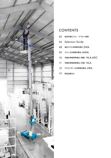 CONTENTS0506080910111213高所作業ビフォー・アフター事例SelectionGuide油圧マスト式昇降作業台EWAウインチ式昇降作業台MWA可搬式荷物用昇降台(電動)HLA-ADC可搬式荷物用昇降台(手動)HLAアルミシザース式昇降作業台LWA啓発活動など
