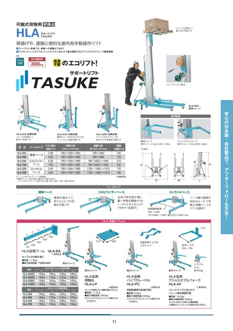 安心の日本製・自社製品で、アフターフォローも万全!可搬式荷物用昇降台HLAサポートリフトTASUKE荷揚げや、運搬に便利な屋内用手動操作リフト■コンパクトに収納でき、車輌への積載もできます■ストラドルベースタイプはパレットサイズに合わせて幅を調節できるアジャスタブルフォーク標準装備仕様A最大積載質量300kgフォークは反転して取り付け可能ですウインチハンドル部分HLA-64A使用イメージ標準装備HLA-64A設置状態フォークは反転して取付け可能ですHLA-64A収納状態標準フォークを外すことができ、コンパクトに収納可能ですHLA-49W収納状態アジャスタブルフォークを取付けての収納も可能です型式ベースタイプリフト高さ(最大)mHLA-35AHLA-49AHLA-64AHLA-78AHLA-35WHLA-49W標準ベーススタビライザーベースストラドルベース3.484.936.387.833.494.94収納寸法(W×L×H)mm790×1050×1990790×1050×1990790×1050×1990790×1050×1995790×1040×1990790×1040×1990※[]はスタビライザーベース使用時※標準フォーク:奥行690×幅570×厚み50mmアジャスタブルフォーク:奥行700×幅(555・665・740)×厚み60mm設置寸法(W[D]×E)mm質量(自重)kg790×1890790×1890790[1800]×1890790[1800]×1890(790~1490)×1910(790~1490)×1910150170210230170190※運賃別途標準フォーク取付イメージ(HLA-35A〜78A)アジャスタブルフォーク取付イメージ(HLA-35W、49W)寸法図EHDWL標準ベース標準仕様タイプ。折りたたんでの収納が可能ですベースタイプスタビライザーベース左右の安定感が増し、重い荷物を側面からもしっかりと支えることができます(収納可)HLA共通オプションストラドルベースベース幅の調節が50mmピッチで可能な伸縮ベースタイプ(収納可)▶◀伸縮調節範囲790〜1490(内寸600〜1300、最大内寸1300)mm③②①20020050④400200570680設置径最大:φ735(2本1セット)(mm)指定ピッチ内554〜739上下どちらからも取付可能HLA型用ブームHLA-BA※運賃別途ホイストの代替え等に●質量:11.5kg●最大使用質量:下記表を参照取付イメージHLA-ADCシャックル取付位置型式HLA-30ADCHLA-45ADCHLA-59ADCHLA-74ADC型式HLA-35AHLA-49AHLA-64AHLA-78A①155㎏145㎏140㎏130㎏①155kg145kg140kg130kg②185㎏175㎏165㎏155㎏②185kg175kg165kg155kg③235㎏215㎏200㎏185㎏③235kg215kg200kg185kgHLAシャックル取付位置④245kg245kg245kg230㎏④300kg275kg250kg230kg取付イメージ取付イメージ取付イメージHLA型用荷物台HLA-LP※運賃別途パレットを使用しない荷物の積み下ろしに●質量:11.0kg●最大積載質量:300kg※アジャスタブルフォークへの取付けはできませんHLA型用パイプクレードルHLA-PC※運賃別途空調設備等の配管作業に●質量:5.5kg●最大積載質量:235kg※アジャスタブルフォークへの取付けはできませんHLA型用アジャスタブルフォークHLA-AF※運賃別途パレットサイズに合わせてフォーク幅を調節可能●質量:18.0kg●最大積載質量:300kg※HLA-35W、49Wには標準装備※荷物台とパイプクレードルの取付けはできません11